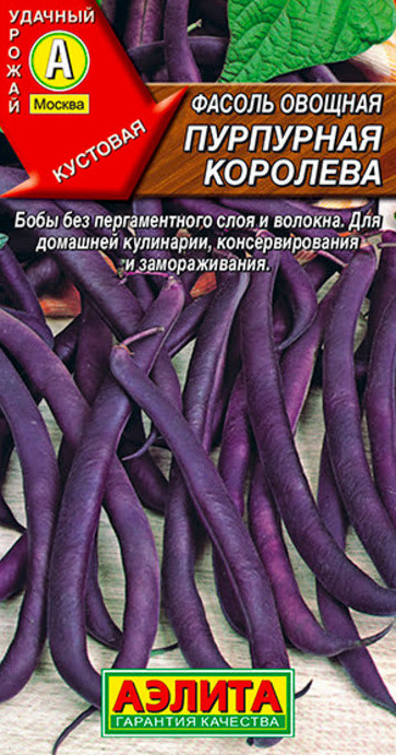 Фасоль овощная Пурпурная королева - это среднеспелый сорт, период от всходов до технической спелости 55-60 дней. Растения кустовые, низкорослые, не требующие опоры. Бобы длиной 15-17 см, шириной 1,0-1,3 см, в технической спелости без пергаментного слоя и волокна. Масса 100 бобов 450-600 г. Вкусовые качества продукции отличные. Рекомендуются для домашней кулинарии, консервирования и замораживания. Урожайность бобов в технической спелости – 1,6-3,0 кг/м2. Сорт устойчив к бактериозу, хорошо переносит засуху и пониженные температуры. Перед посевом семена замачивают в воде до набухания.Посев семян в открытый грунт на глубину 2-3 см. После появления всходов проводят прореживание. У спаржевой фасоли растянутый период сбора урожая, поэтому его проводят многократно по мере созревания бобов. Растениям необходимы своевременные поливы, прополки, рыхления и подкормки.