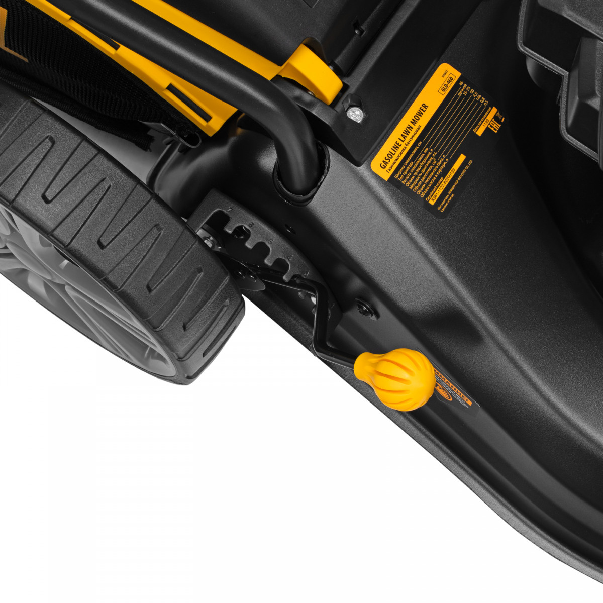 - Быстрая настройка — эксцентриковые фиксаторы ручки позволяют оперативно перевести газонокосилку в рабочее или транспортировочное положение, а 3 точки крепления обеспечивают регулировку вылета ручки под рост пользователя.