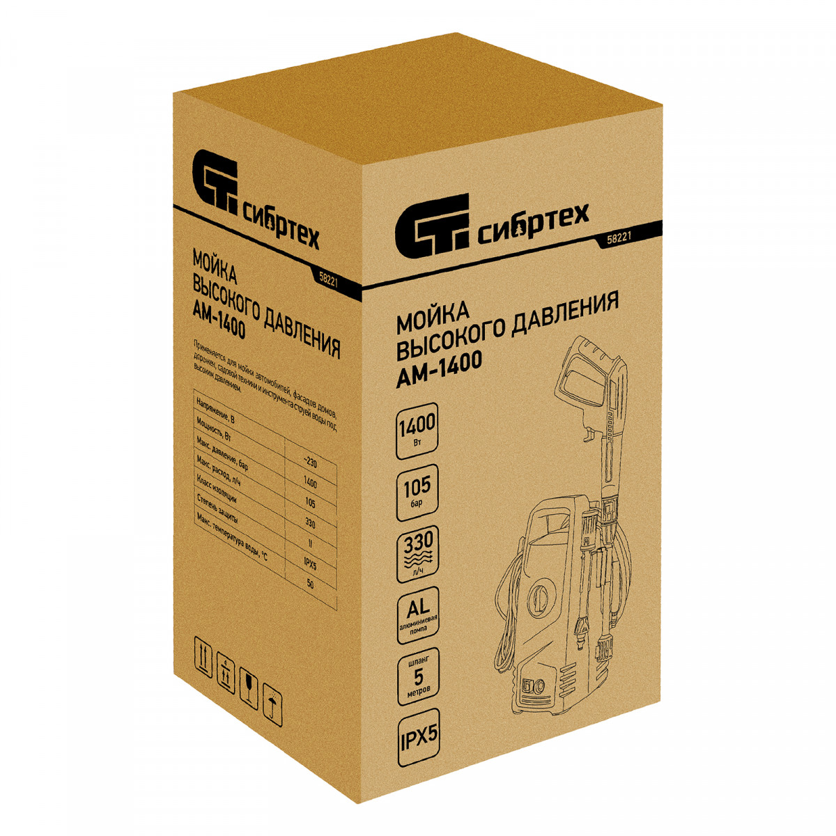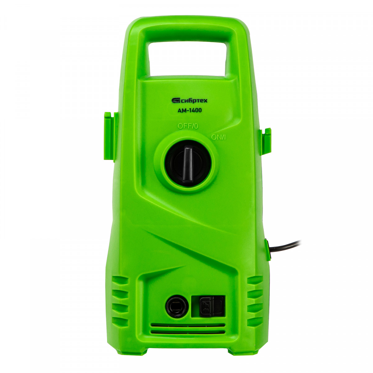 Моечная машина высокого давления Сибртех АМ-1400 58221 мощностью 1400 Вт работает, с максимальным давлением 105 бар, обеспечивает производительность 330 л/ч. Справится с такими задачами, как: бесконтактная очистка автомобиля, фасадов зданий, садовых дорожек, заборов, строительной техники, велосипедов. Она может не только забирать воду из водопровода, но и всасывать ее из резервуаров. Мощности 1,4 кВт и расхода воды 330 л в час достаточно для очищения поверхностей от старых масляных пятен и въевшейся грязи.