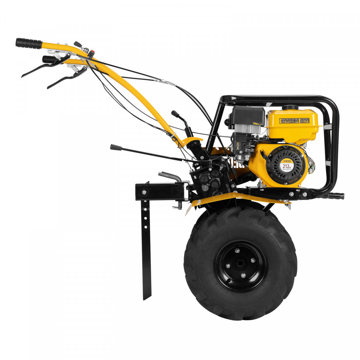 - Повышенная проходимость — мотоблок оснащен тракторными пневматическими колесами.