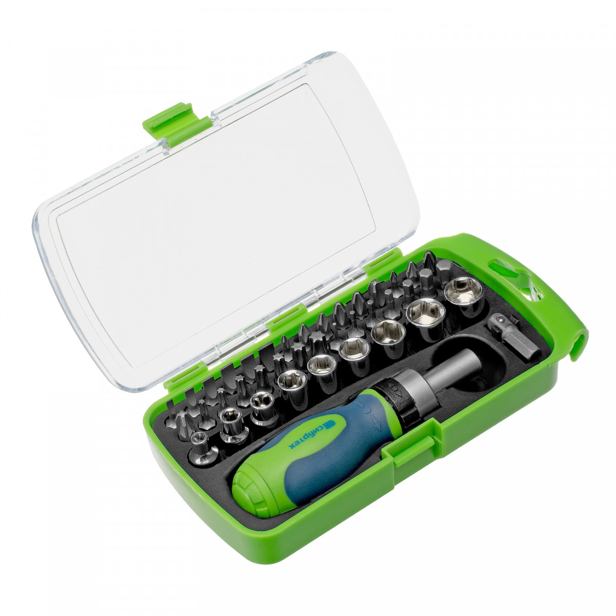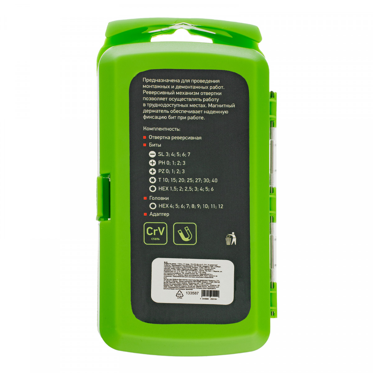 Отвертка реверсивная - 1 штБиты 25 мм: РН0, РН1, РН2, РН3, PZ0, PZ1, PZ2, PZ3, SL3, SL4, SL5, SL6, SL7, H1.5, H2, H2.5, H3, H4, H5, H6, T10, T15, T20, T25, T27, T30, T40 - 27 штТорцевые головки: 4 мм, 5 мм, 6 мм, 7 мм, 8 мм, 9 мм, 10 мм, 11 мм, 12 мм - 9 штАдаптер для бит 1/4'' - 1 шт