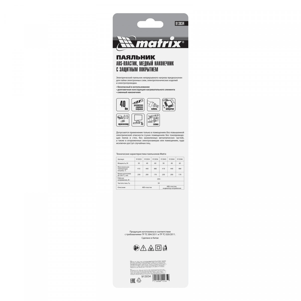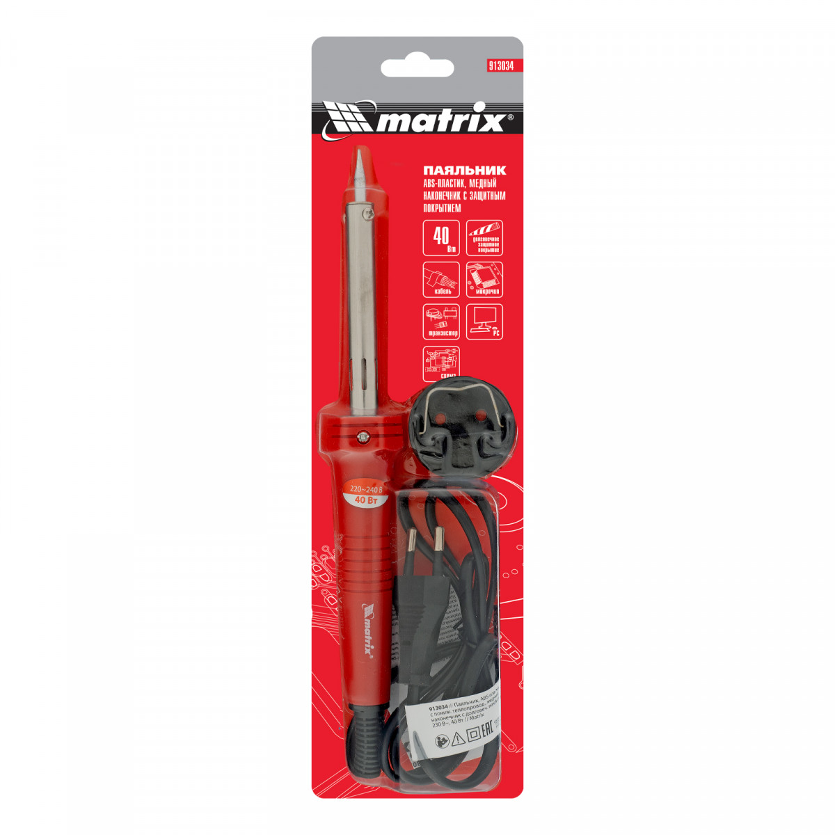 Паяльник, пластик ABS с пониженной теплопроводностью, медный наконечник с долговечным покрытием, 220 В, 40 W Matrix