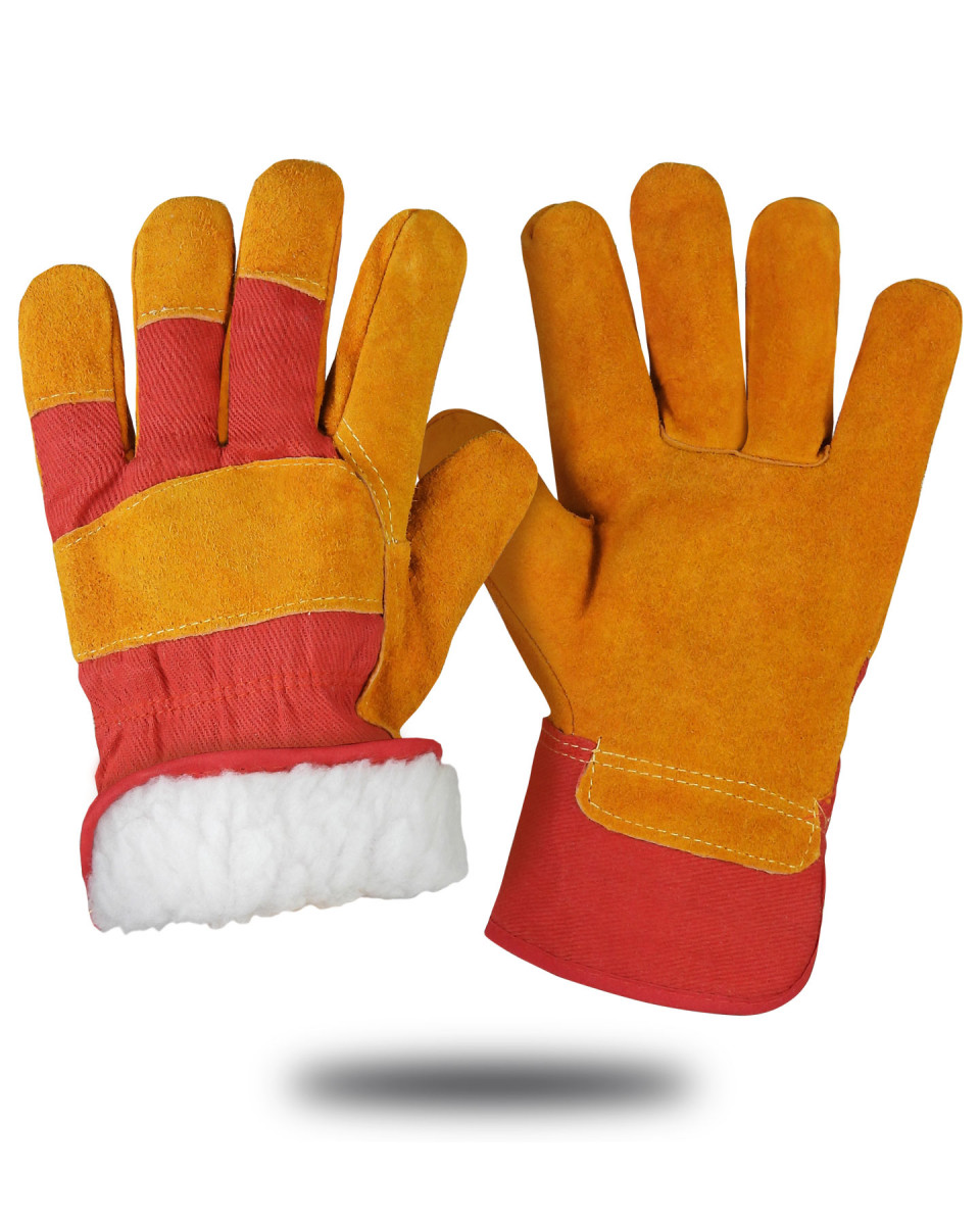 Перчатки комбинирванные, плотная смесовая ткань красного цвета со спилком желтого цвета, усиленная жесткая крага, утеплитель - искусственный мех белого цвета.