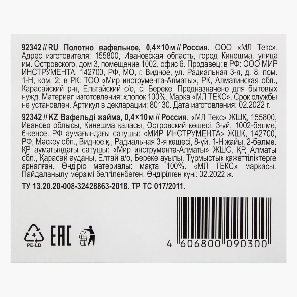 Вафельное полотно 92342 размером 0,4 х 10 м хорошо впитывает влагу и эффективно удаляет загрязнения. Может использоваться во время строительно-монтажных работ, выполнения ремонта различных механизмов, изготовления стекол и зеркал, обтирания оргтехники, автомобильных деталей и поверхностей автотранспортных средств. Пригодится в клининговых компаниях для уборки помещений, а также в медицинской индустрии, общественных учреждениях и сфере общепита.