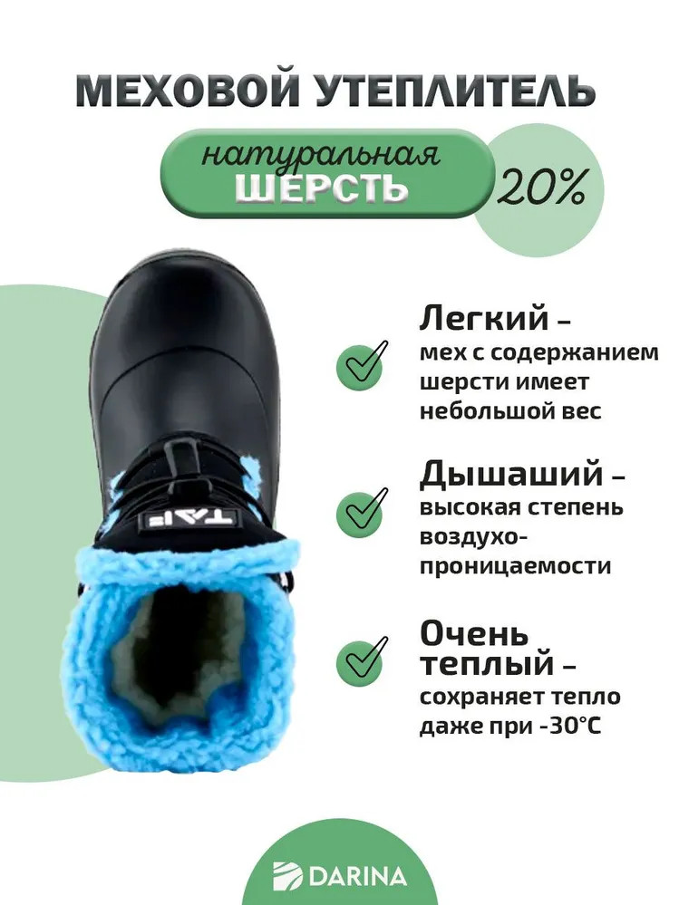 Сохраняют тепло даже при –30 градусах благодаря материалу ЭВА и искусственному меху.