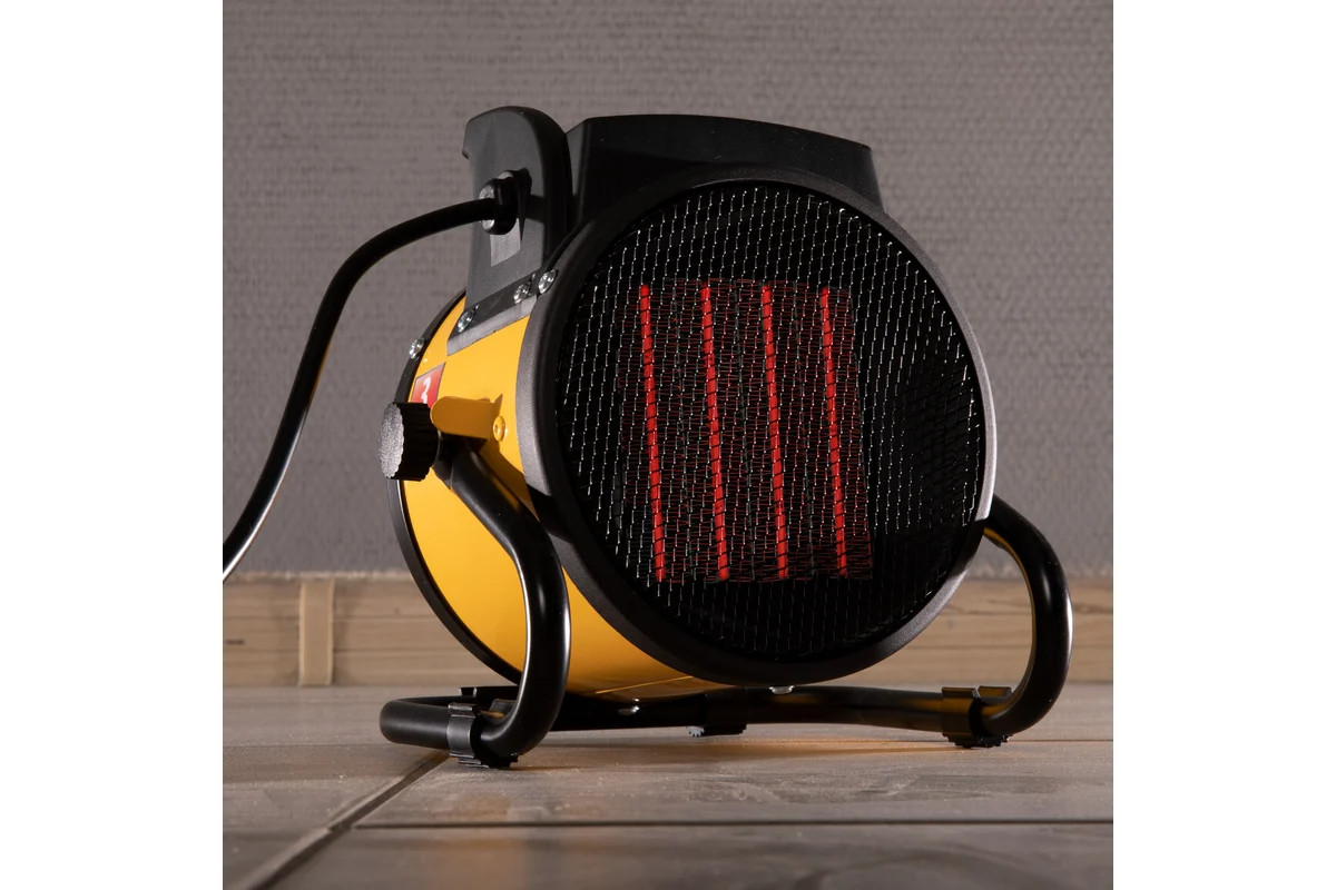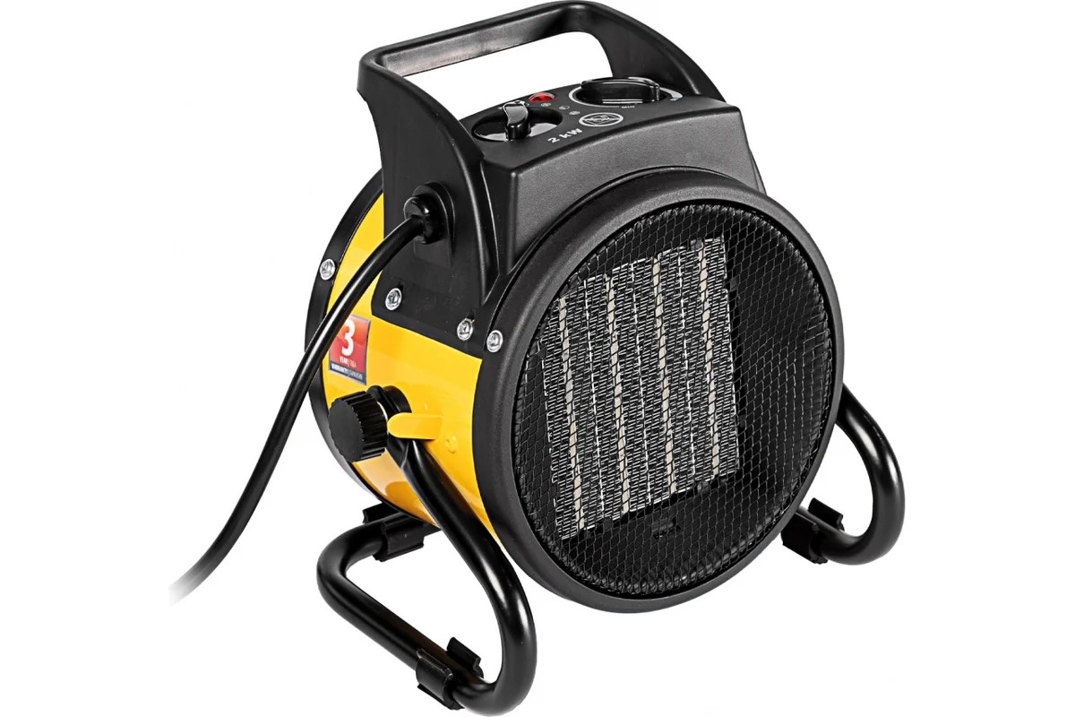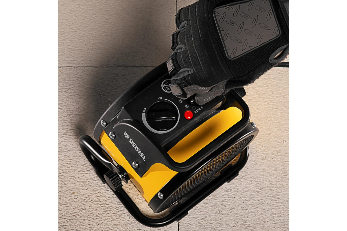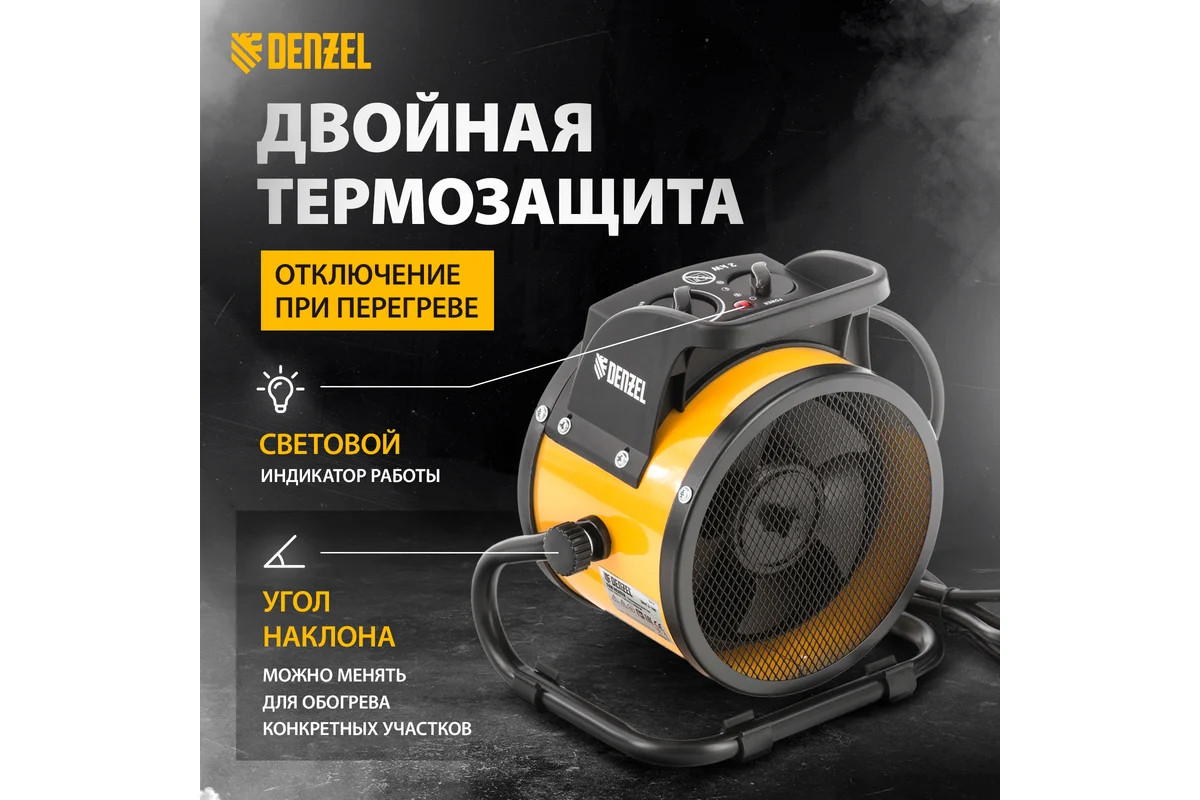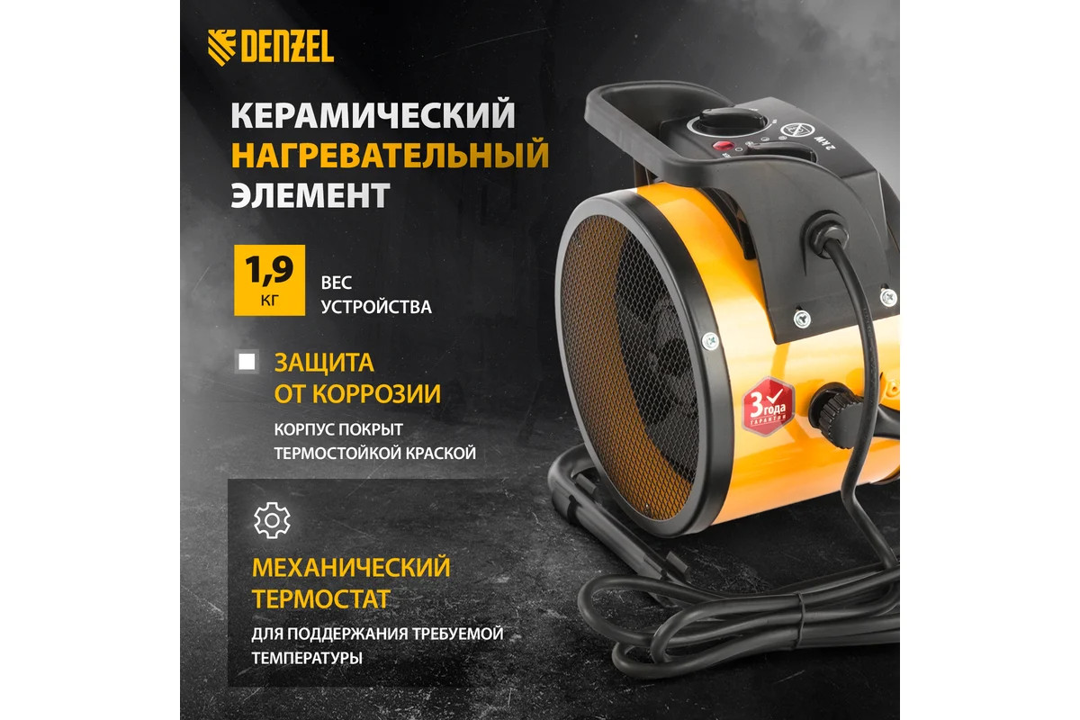 Тепловая пушка (тепловентилятор) Denzel DHC 2-100 96429 с керамическим нагревателем потребляет мощность 0,025, 1 или 2 кВт и пригодится в любую погоду: в холод она обогреет помещение, а в жару ее можно использовать как вентилятор. Также применяется во время отделочных работ для просушки поверхностей — окрашенных и оштукатуренных стен, стяжек. Максимальной мощности 2 кВт хватит для обогрева помещения площадью до 20 кв.м. Работа тепловой пушки не доставляет дискомфорт, безопасна для здоровья людей и животных, поскольку керамический нагревательный элемент не сушит воздух и не выделяет вредных веществ.