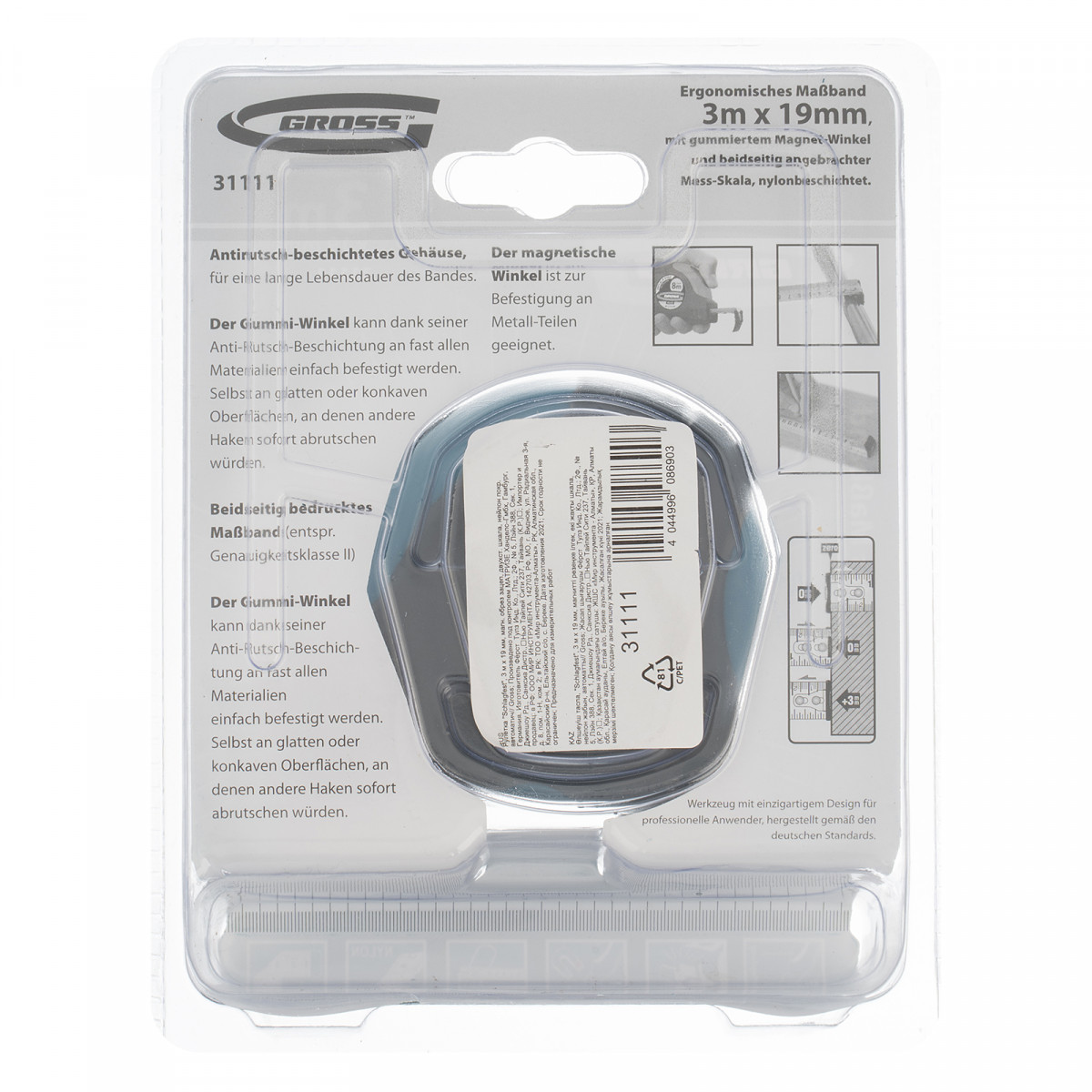 Рулетка "Schlagfest",3 м x 19 мм,магнитный обрезиненный зацеп,двусторонняя шкала,Нейлоновое покрытие,автоматическая фиксация Gross