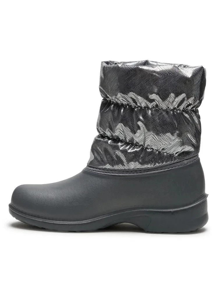 Укороченные лёгкие женские зимние сноубутсы из морозостойкого полимера, утепленные дублированным нетканным ворсовым полотном для большего комфорта. Верх из декорированной фольгой ткани с водоотталкивающей пропиткой дублирован поролоном практичен в уходе. Объем верхней части сапога достаточен для комфортного обувания.