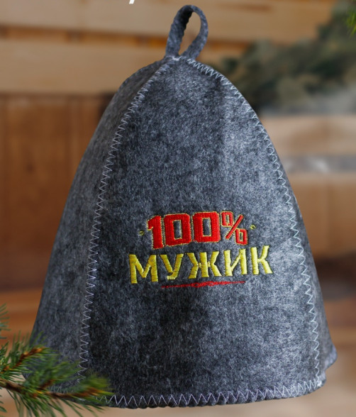 Серый шлем для бани и сауны с вышивкой «100% мужик». Сочетает в себе классический стиль и практичность: изготовлен из ткани с 30% содержанием шерсти и 70% полиэфира. Универсальный размер 55-60 подойдёт практически любому. Темный цвет и изысканная вышивка делают его превосходным дополнением к банному обиходу.