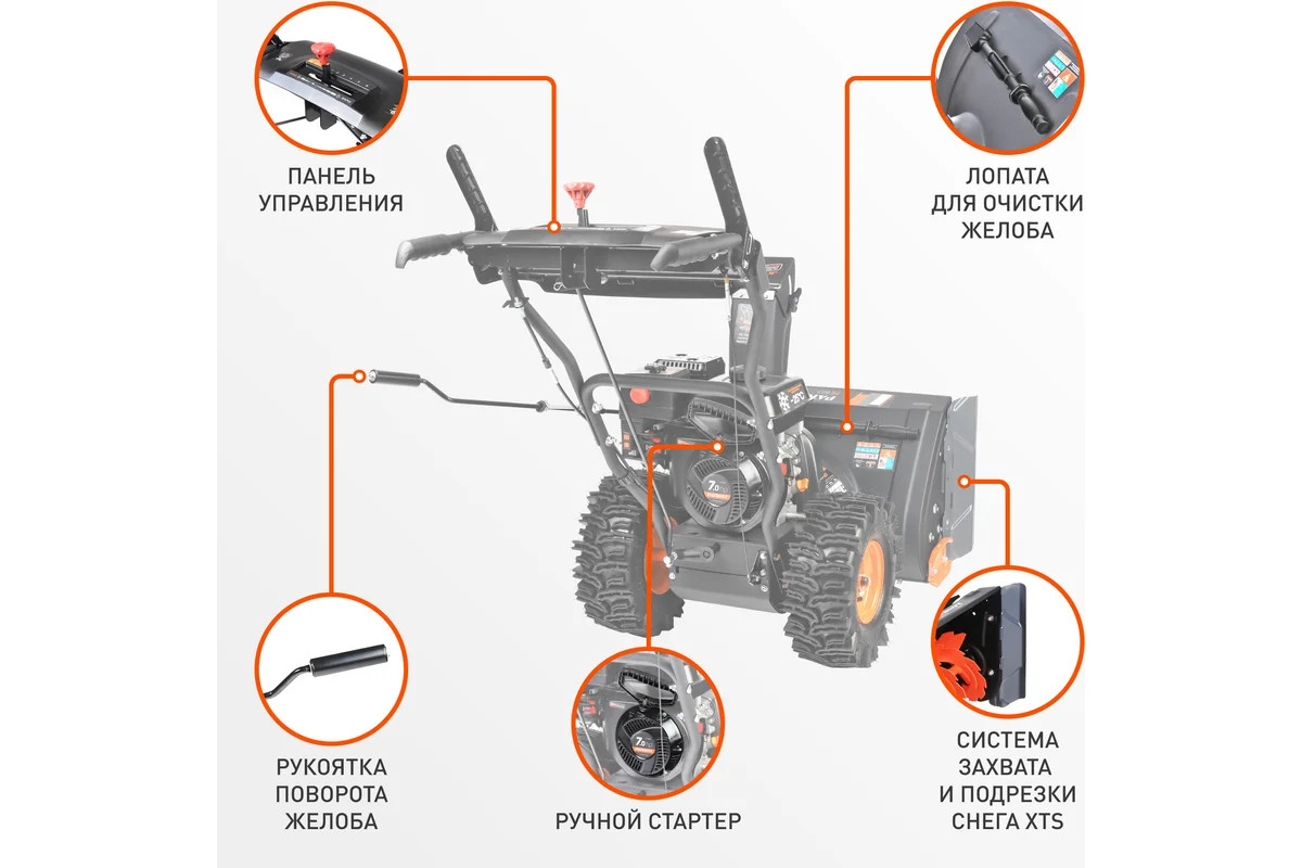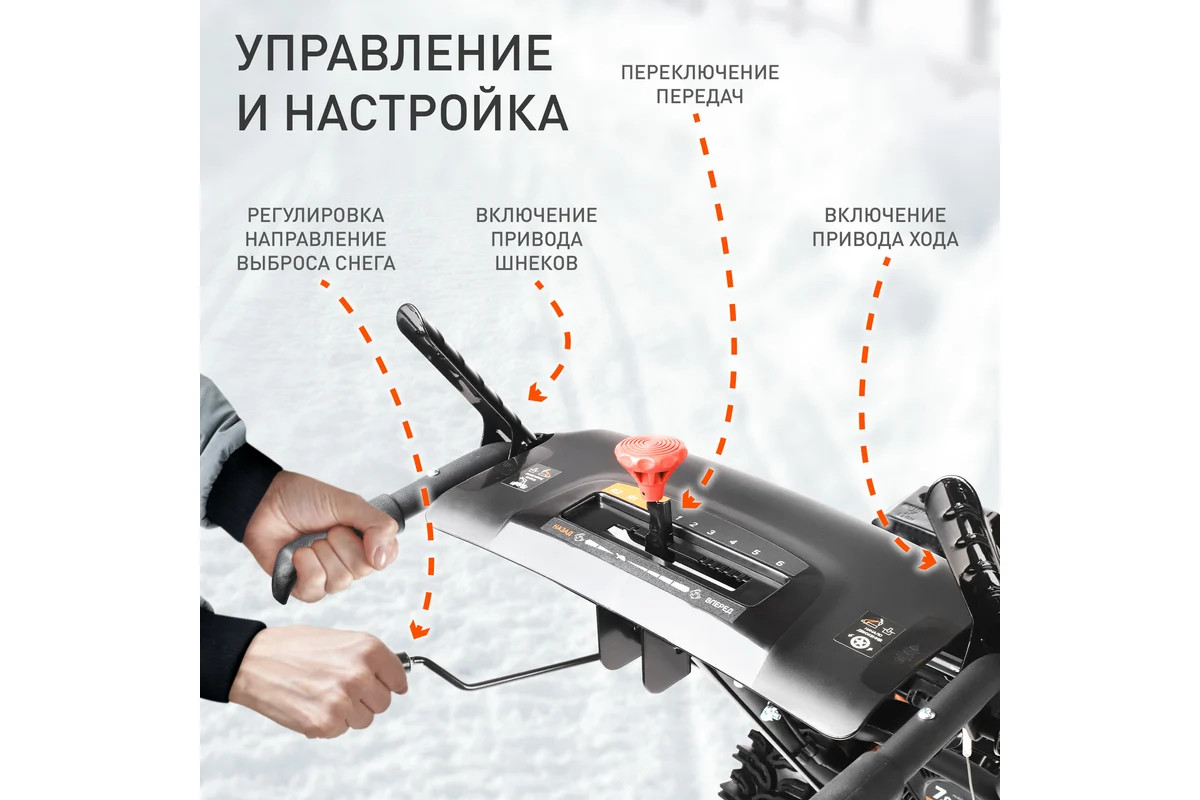 - Регулировка дальности выброса, угол выброса снега 70°;