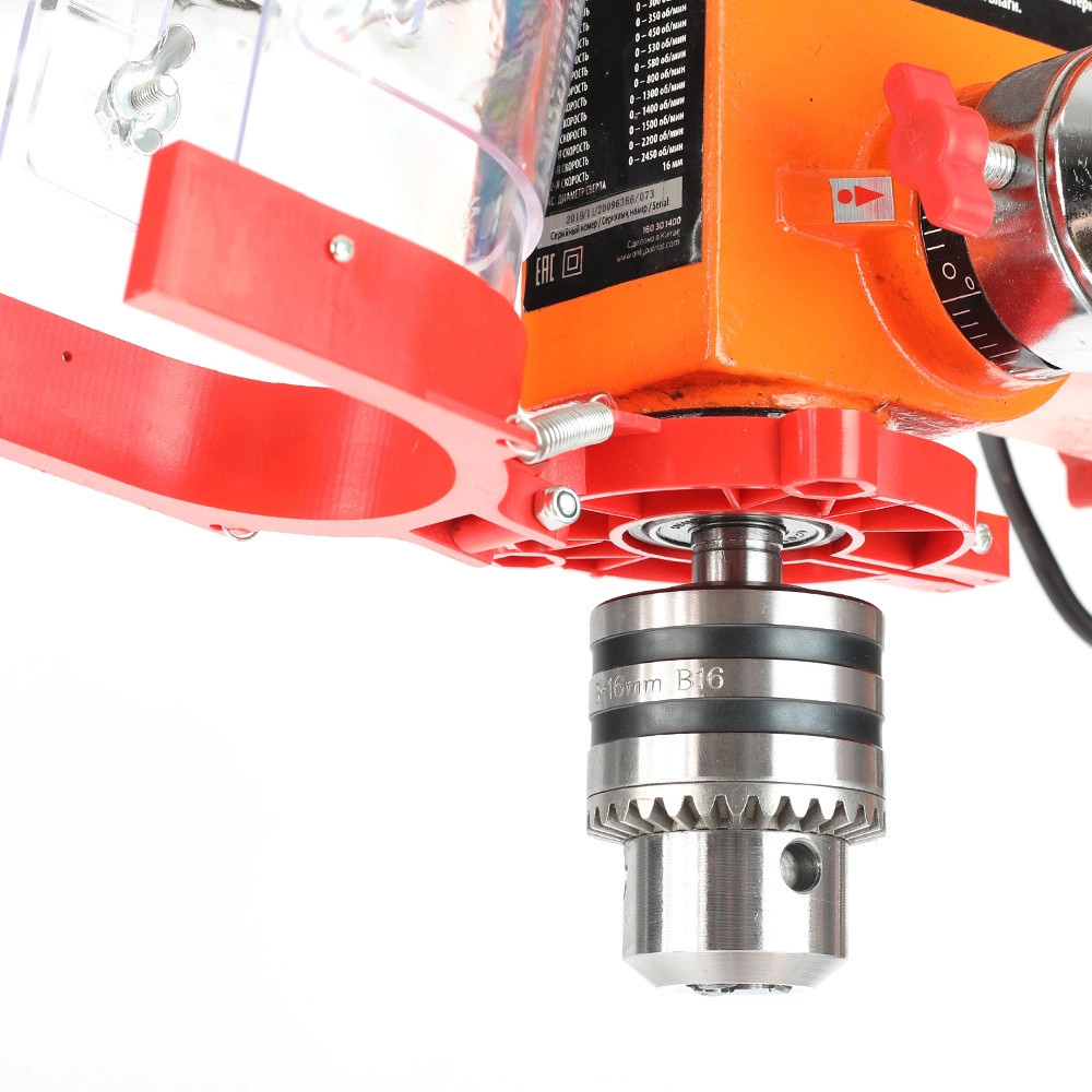 - Прозрачный экран защищает пользователя от попадания искр и мелких частиц при сверлении.