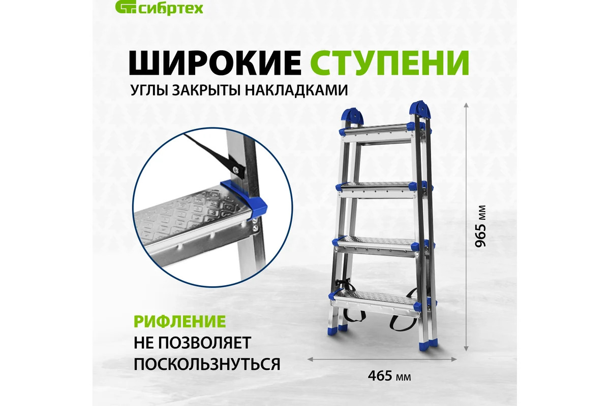 Стремянка двухсторонняя Сибртех 97984 со стальным профилем и 4 стальными ступенями помогает решать бытовые задачи на высоте, превышающей человеческий рост. Ее используют, чтобы доставать предметы с антресолей или шкафов, проводить уборку, менять лампочки, вешать полки или картины. Работать с электроинструментом на ней не рекомендуется. Стремянка с пластиковым складным механизмом повышенной стабильности и широким основанием очень устойчива на ровной поверхности. Площадка находится на высоте 88 см от опорной поверхности, рабочая высота стремянки составляет 288 см (при среднем росте пользователя 170 см).