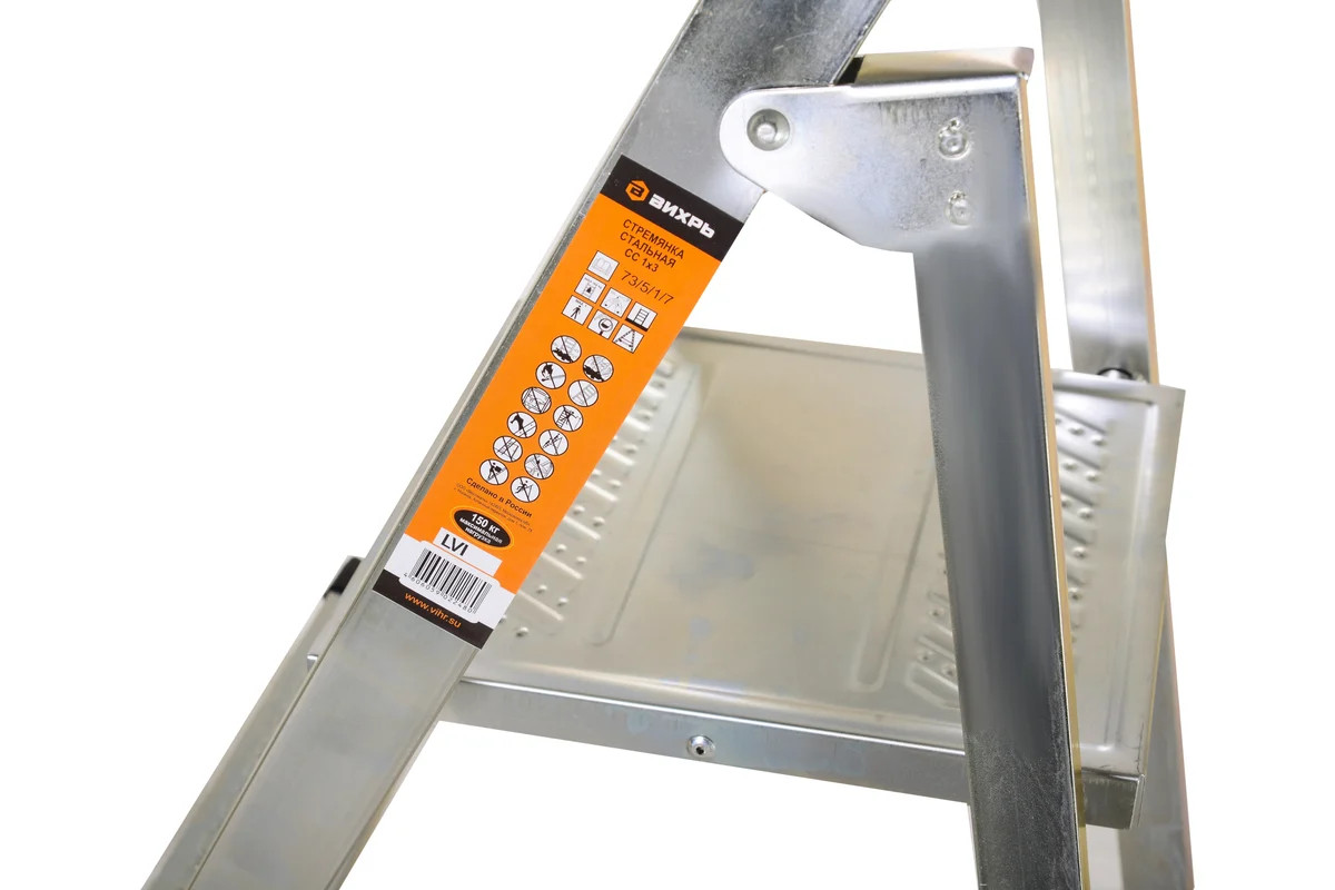 Стремянка стальная ВИХРЬ СС 1х3 позволяет быстро и безопасно достигать высоких мест. Рабочая площадка находится на высоте 0,59 м.