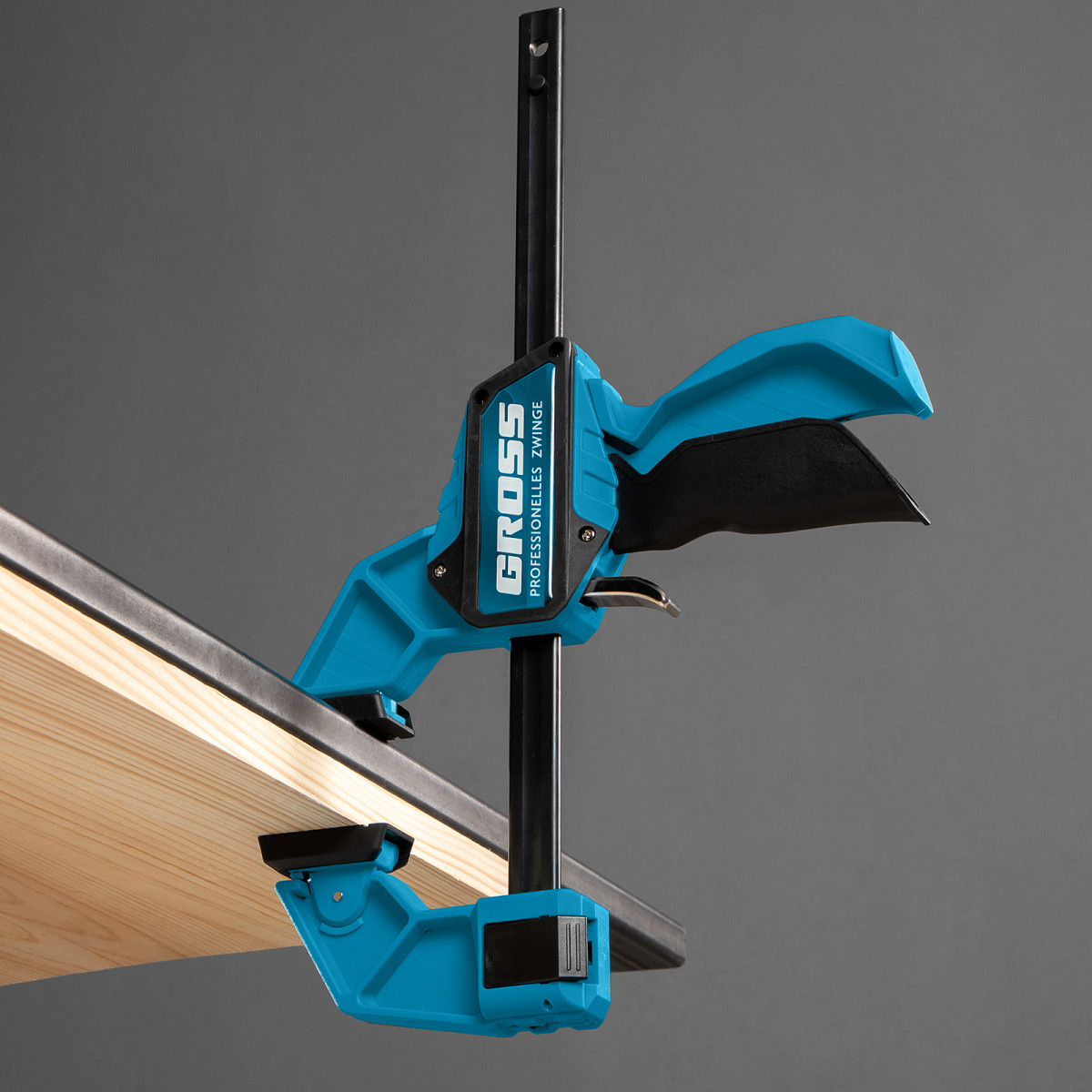 - Многофункциональность — опорную губку можно переставить на другой конец рейки, чтобы использовать струбцину как распорный инструмент.