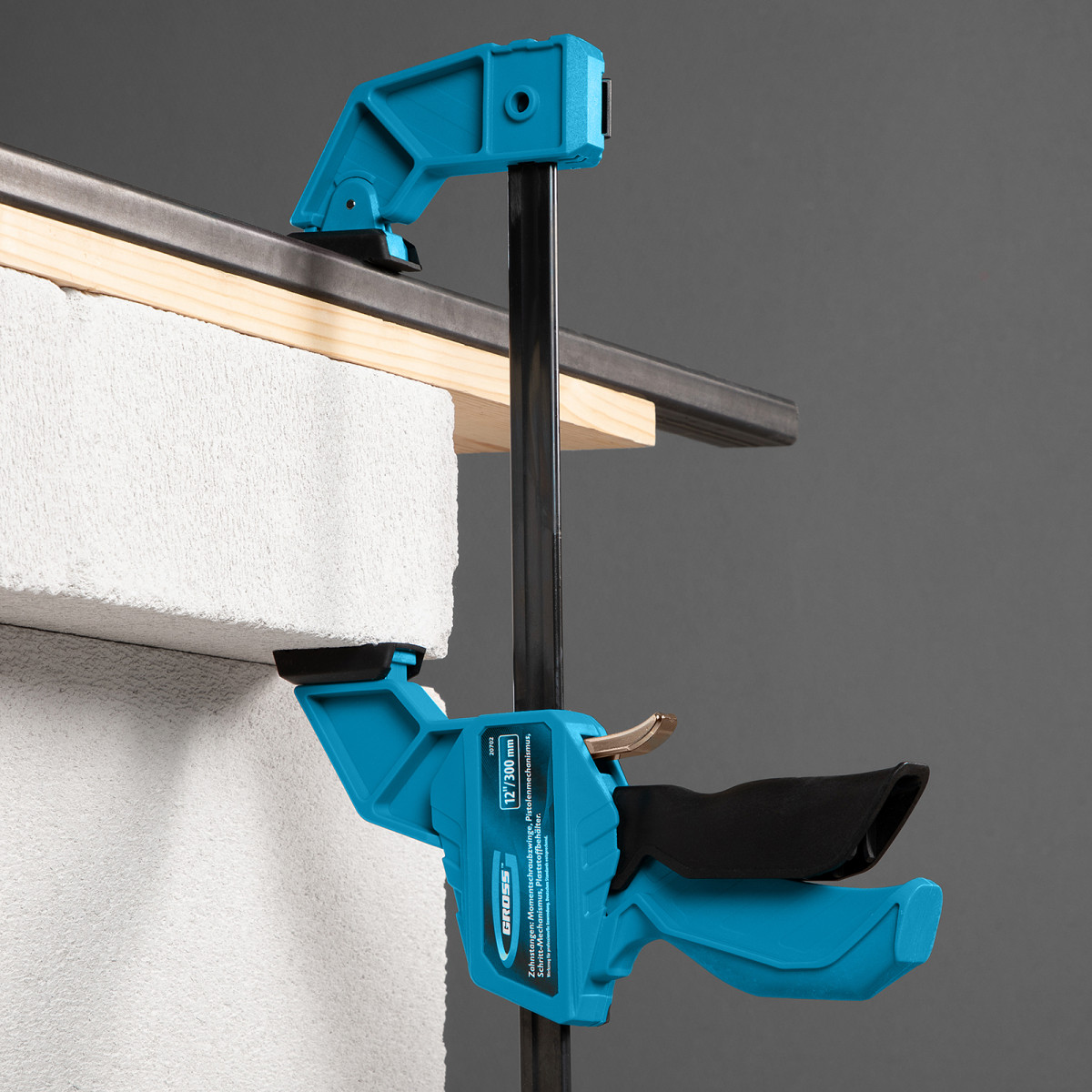 Реечная быстрозажимная струбцина Gross 20702 пистолетного типа, с пластиковым корпусом, с шириной зажима 300 мм, с пошаговым механизмом, используется для зажимания заготовок при выполнении столярных или монтажных работ. Удобна для фиксации деревянных деталей, т. к. пластиковые накладки на губках не повреждают их поверхность при сжатии. Подвижная губка пошагово перемещается по рейке, постепенно зажимая обрабатываемый предмет. Курковый фиксатор удерживает ее в заданном положении. Инструмент рекомендован для профессионального использования.