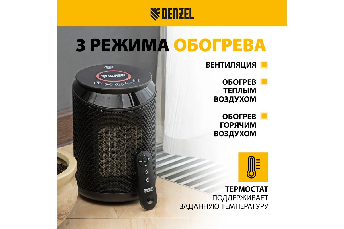 Электрический тепловентилятор Denzel DTFC-2000, керамический, пульт, 3 режима, вентилятор, нагрев 1000/2000 Вт 96419 с керамическим нагревательным элементом предназначен для обогрева и вентилирования бытовых помещений площадью до 20 м.кв.