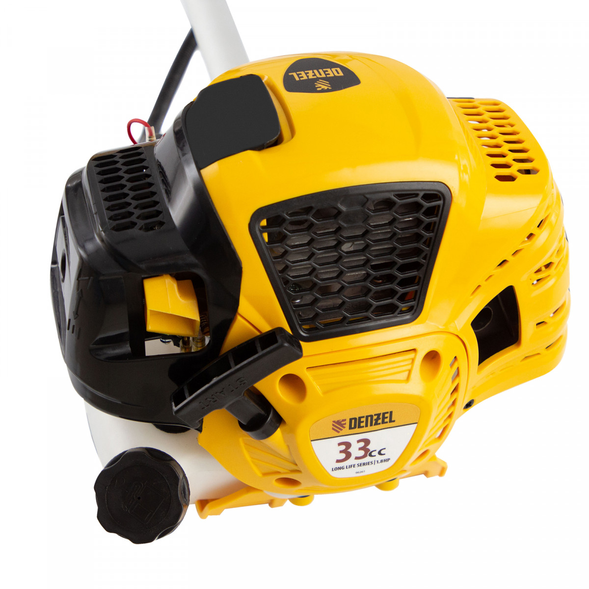 Бензиновый триммер Denzel DTL-33 96261 с объемом двигателя 33 см3 и неразъемной штангой подходит как для частичного подравнивания газона, так и скашивания травы всех типов, в том числе с жесткими древовидными стеблями (полыни, крапивы, лебеды, борщевика). Также эффективен для срезания кустарника и молодых побегов деревьев с диаметром стволов до 10 мм. Два режущих инструмента — леска и пильный диск — работают на скорости 9500 об/мин и обеспечивают ширину скашивания 42 и 25,5 см соответственно. Двигатель мощностью 1,8 л.с. экономично потребляет топливо, поэтому часто заправлять бак не придется. Триммер не требует подключения к стационарному источнику питания и может использоваться в самом отдаленном уголке дачного участка.