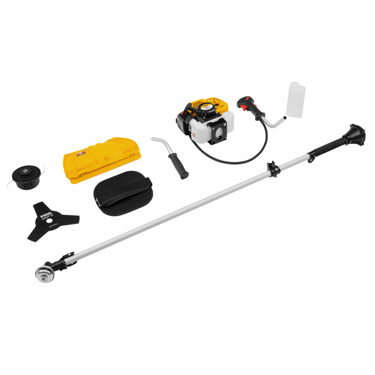 Двигатель с правой рукояткой - 1 штЛевая рукоятка - 1 штШтанга в сборе с редуктором и корпусом сцепления - 1 штЗащитный кожух с ножом - 1 штКатушка с леской - 1 штТрехлопастной диск - 1 штРемень плечевой с защитой бедра - 1 штДозатор для приготовления смеси - 1 штУзел крепления рукояток с крепежом - 1 штСвечной ключ - 1 штИмбусовый ключ Н4 - 1 штИмбусовый ключ Н5 - 1 штБолт M6×30 - 4 штБолт M6×25 - 2 штХомут - 2 штРуководство пользователя - 1 шт